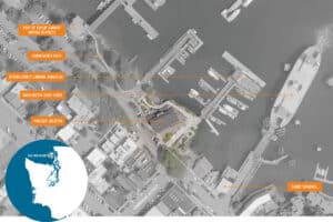 The original building burned down in a fire in 2013, displacing some of the island’s waterfront/tourism businesses, including the beloved locally owned restaurant, Downriggers. The Port immediately initiated a process to rebuild and expand the capacity of the site to support economic activity and to better implement connectivity along the shore’s edge. The placemaking work begins here as we consider the variety of ways the design and rebuilding of this project on the Salish Sea will bolster the city, respect the environment, and celebrate its waterfront location leading to the ultimate goal of generating a relationship between people and place.