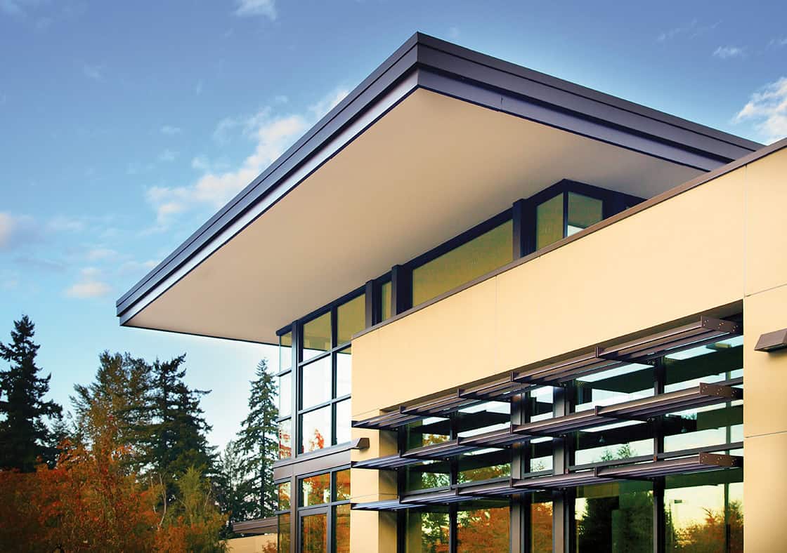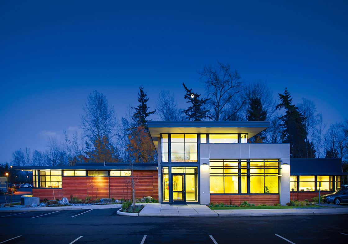 The primary design goal established by the Bellingham OB/GYN medical team was to provide a calming experience for expectant parents visiting the clinic. As a result, the most minute details were part of the design strategy, from ensuring that the sloping parking lot grade prevented expectant mothers from having to navigate curbs, to creating an inviting entry procession by landscaping the pathways from the parking lot to the building. As patients approach the building, broad cantilevered roof forms reach out and welcome them while providing protection from rain and sun. Massing and detailing are intentionally simple and linear to evoke a sense of order and harmony.