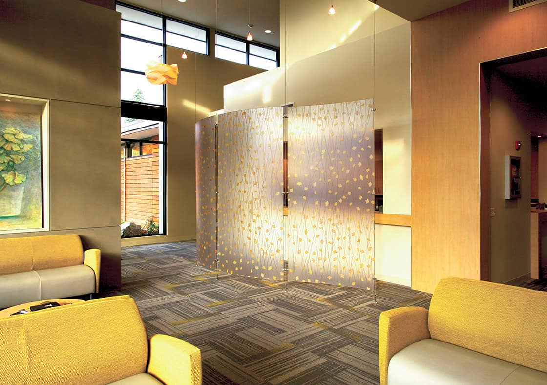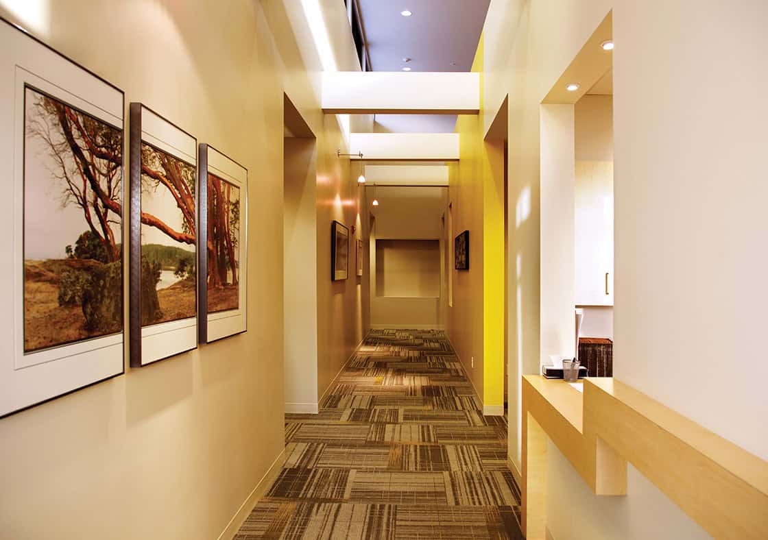 The central volume of the clinic allows the interior spaces to be filled with natural light, not only in the public areas, but deep into the building. Even the exam rooms have narrow window banners that allow for privacy but bring in daylight. A soothing color palette and comfortable furnishings reinforce the design goal. Lovely interior details, including a translucent screen in the waiting room with natural branches and leaves pressed into it functions as both a HIPPA privacy screen and a primary design element. Its curved form inserted into the rectilinear space adds a feminine energy to the geometry.